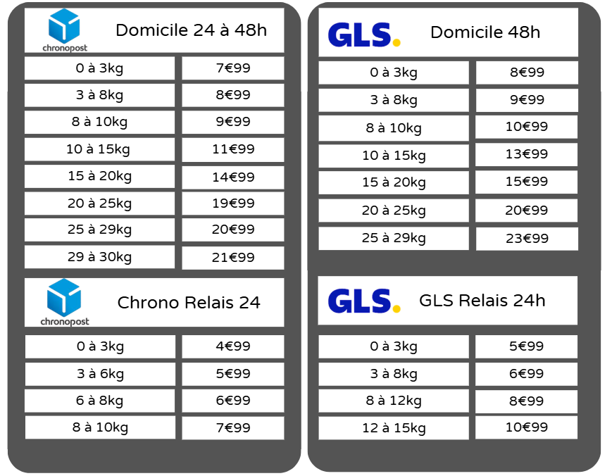Des délais de livraisons exceptionnels peuvent être occasionnés. Les sociétés Chronopost et GLS ne livrent pas les Samedis.